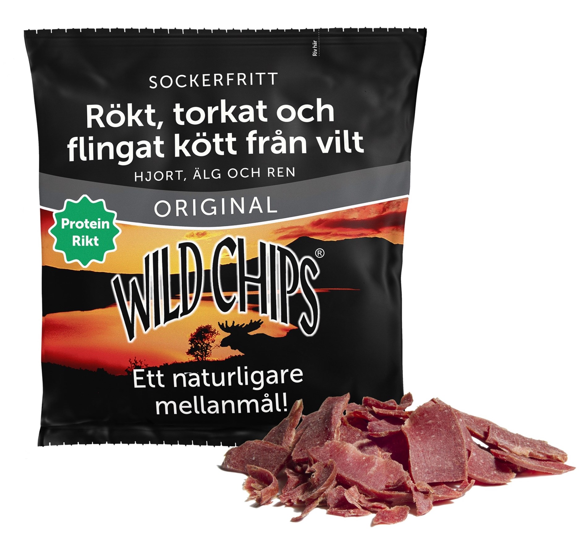 En snack lavet af let røget, tørret og strimlet kød fra elg, hjort og rensdyr. Wild Chips er en delikatesse i snackformat og et praktisk mellemmåltid med sundhed i fokus på én og samme tid.